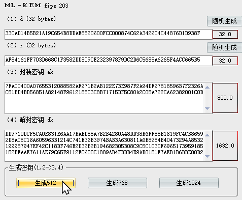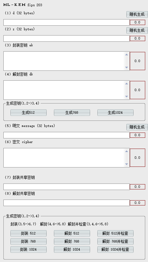 本PQC工具实现了fips-203, 204, 205三个功能,每个功能包括生成密钥对、读取生成的密钥对,对数据进行封装、解封或签名、验签。