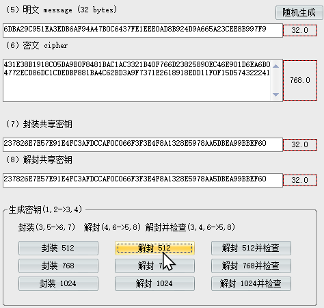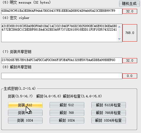 填入随机数,明文信息,则可进行封装操作,封装会产生封装结果和共享密钥。