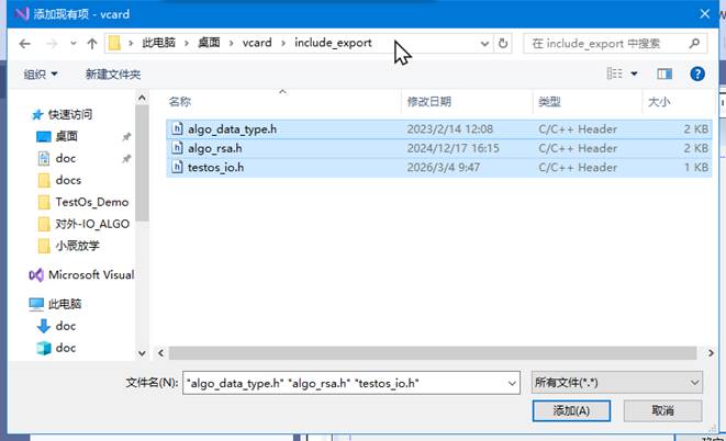 本手册中涉及IO_Algo.dll(32位),IO_Algo64.dll(64位)和vcardio.h(也可能是其他名字,如testos_io.h),以及根据dll不同版本,配套的其他头文件(如当前提供了rsa算法)。